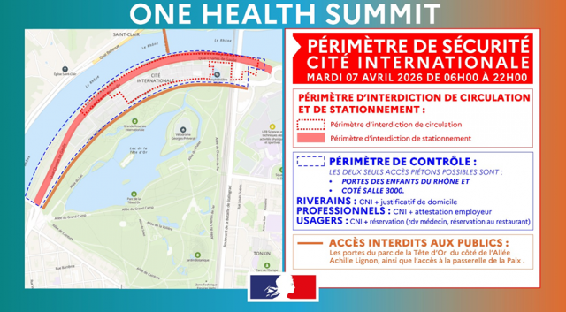 La circulation sera interrompue sur le quai Charles de Gaulle (entre la porte des Enfants du Rhône et le rond-point Raymond Poincaré). La passerelle de la Paix sera aussi fermée, comme tous les accès depuis le parc de la Tête d'Or et les berges piétonnes du Rhône.